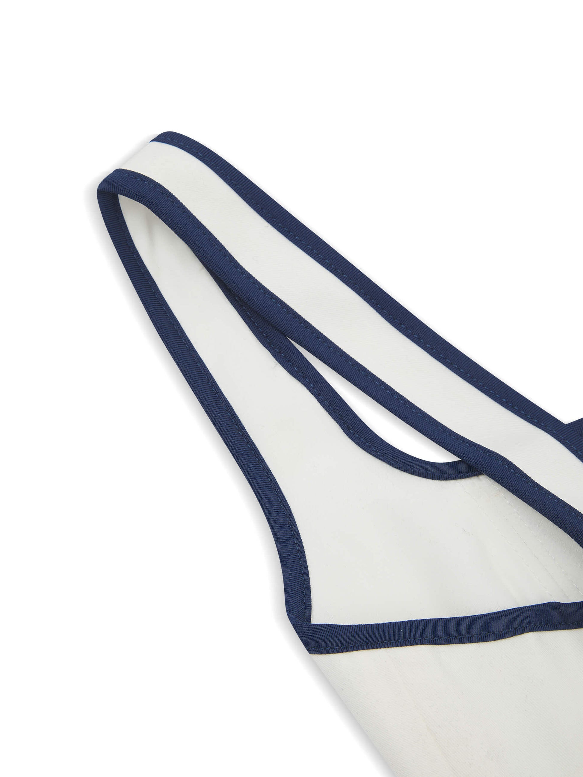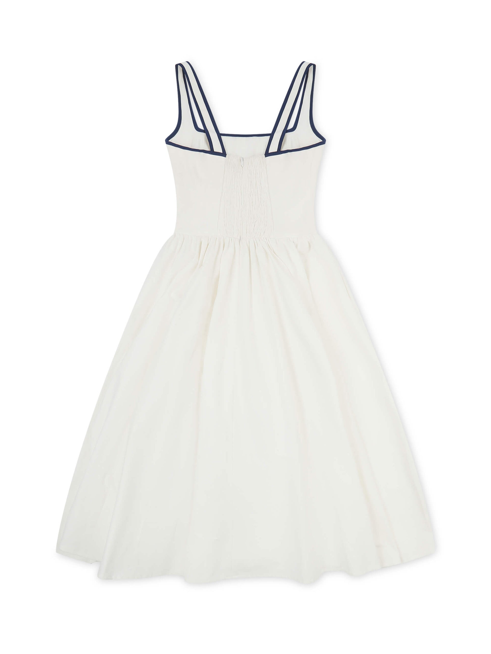 The Corseted Square Neck Midi Dress is made from crisp white cotton and finished with contrast navy piping that frames the shape just right. The corset-inspired bodice with a shirred back for extra comfort, and square neckline add subtle structure, while the midi skirt flows easy from the waist down. Side seam pockets keep it practical — because we’re all about form and function.