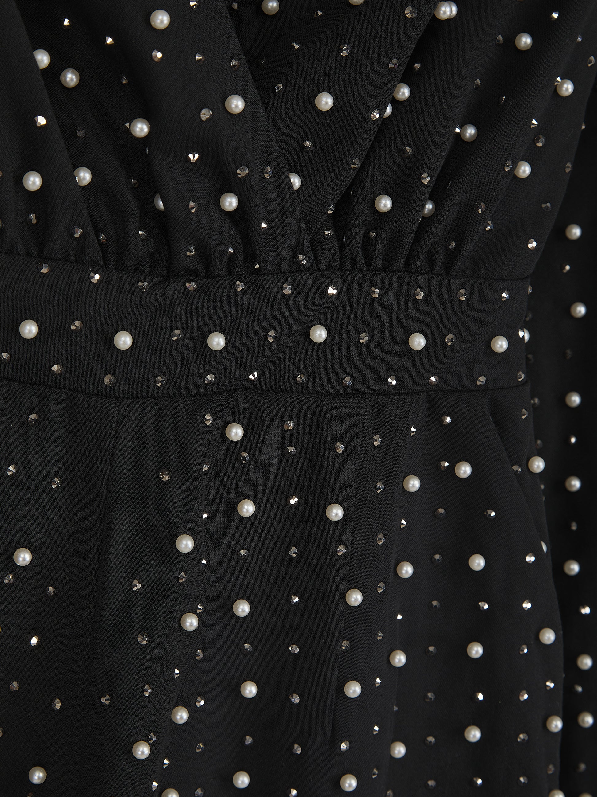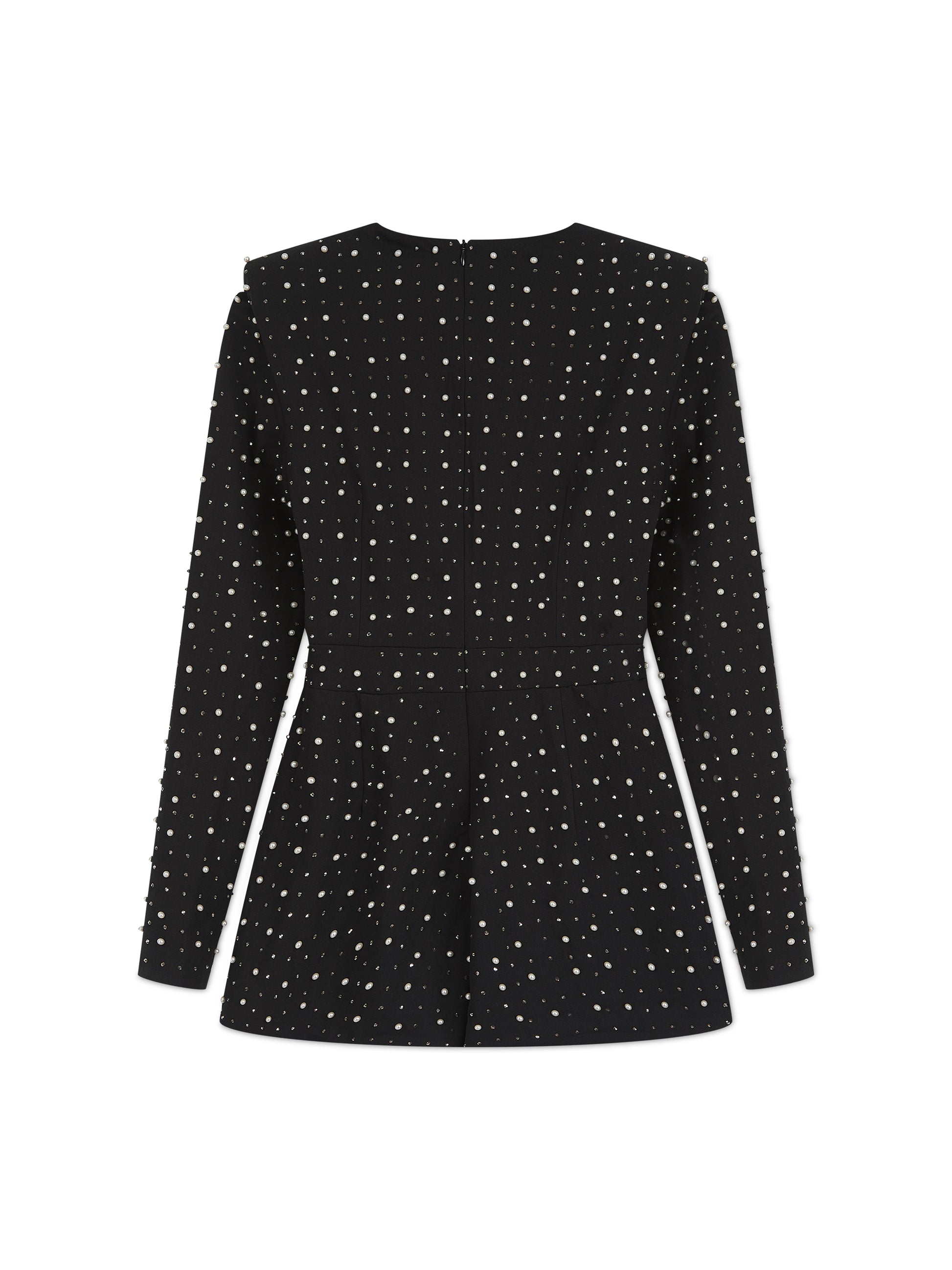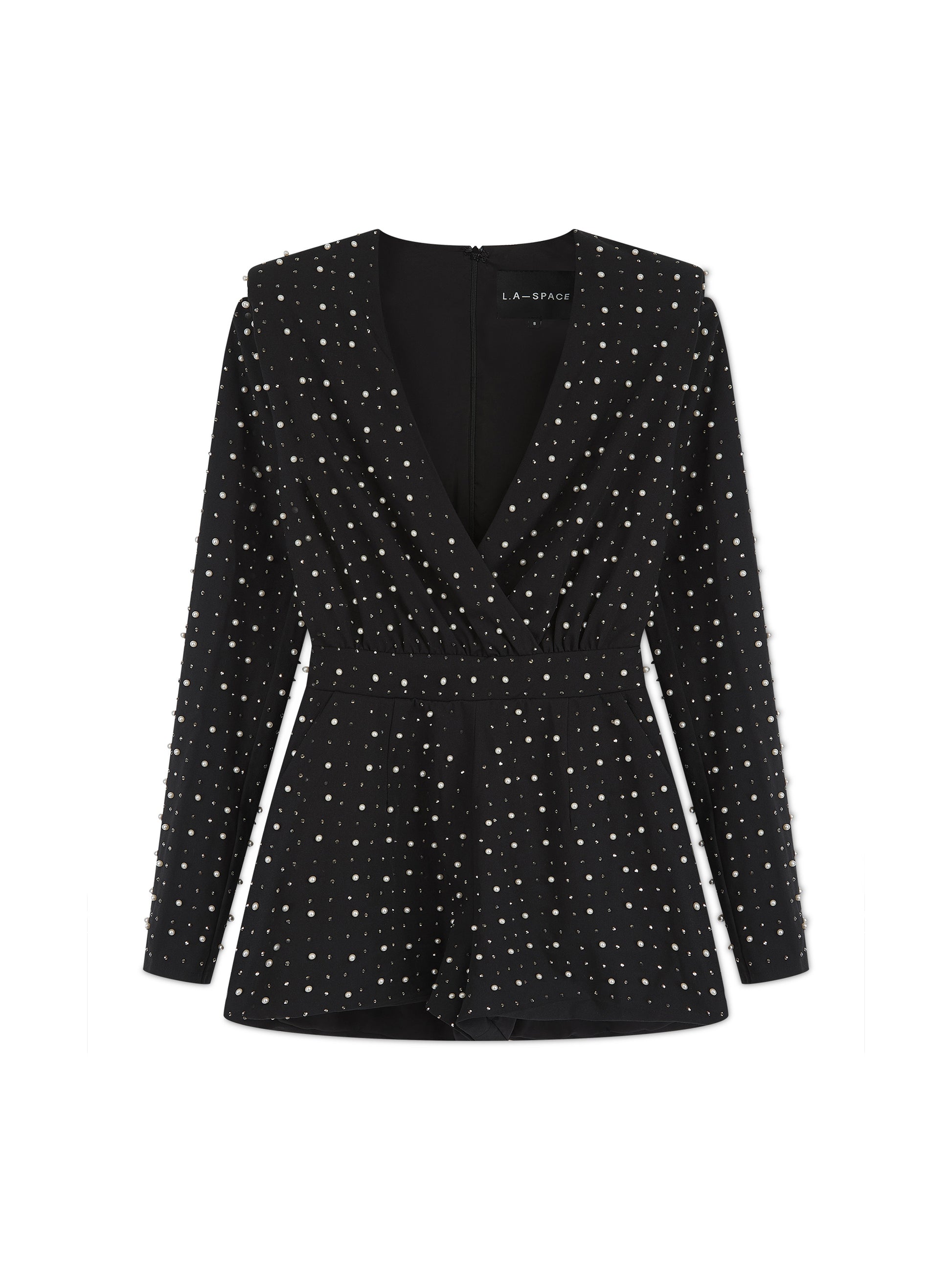 This all-over rhinestone and pearl intricately embellished playsuit is cut for a tailored fit with strong shoulders that create powerful proportions. Featuring a flattering plunged wrap neckline, loosely fitted shorts that create a leg lengthening silhouette, pockets, and an enclosed centre-back zip fastening, this playsuit is a timeless addition to your occasion wardrobe.
