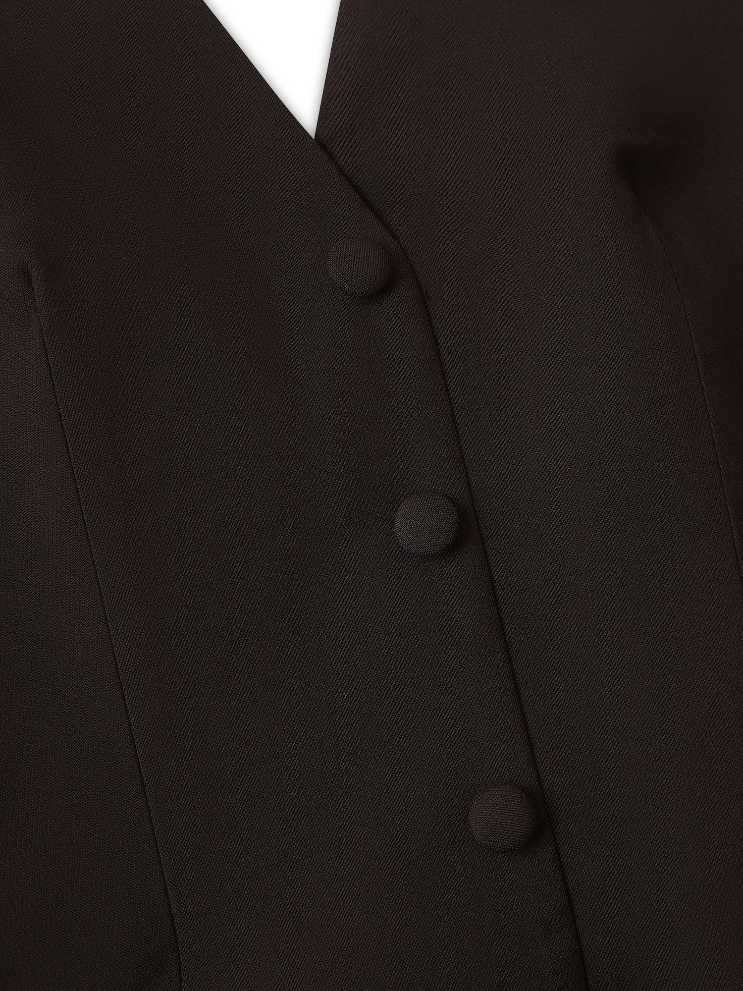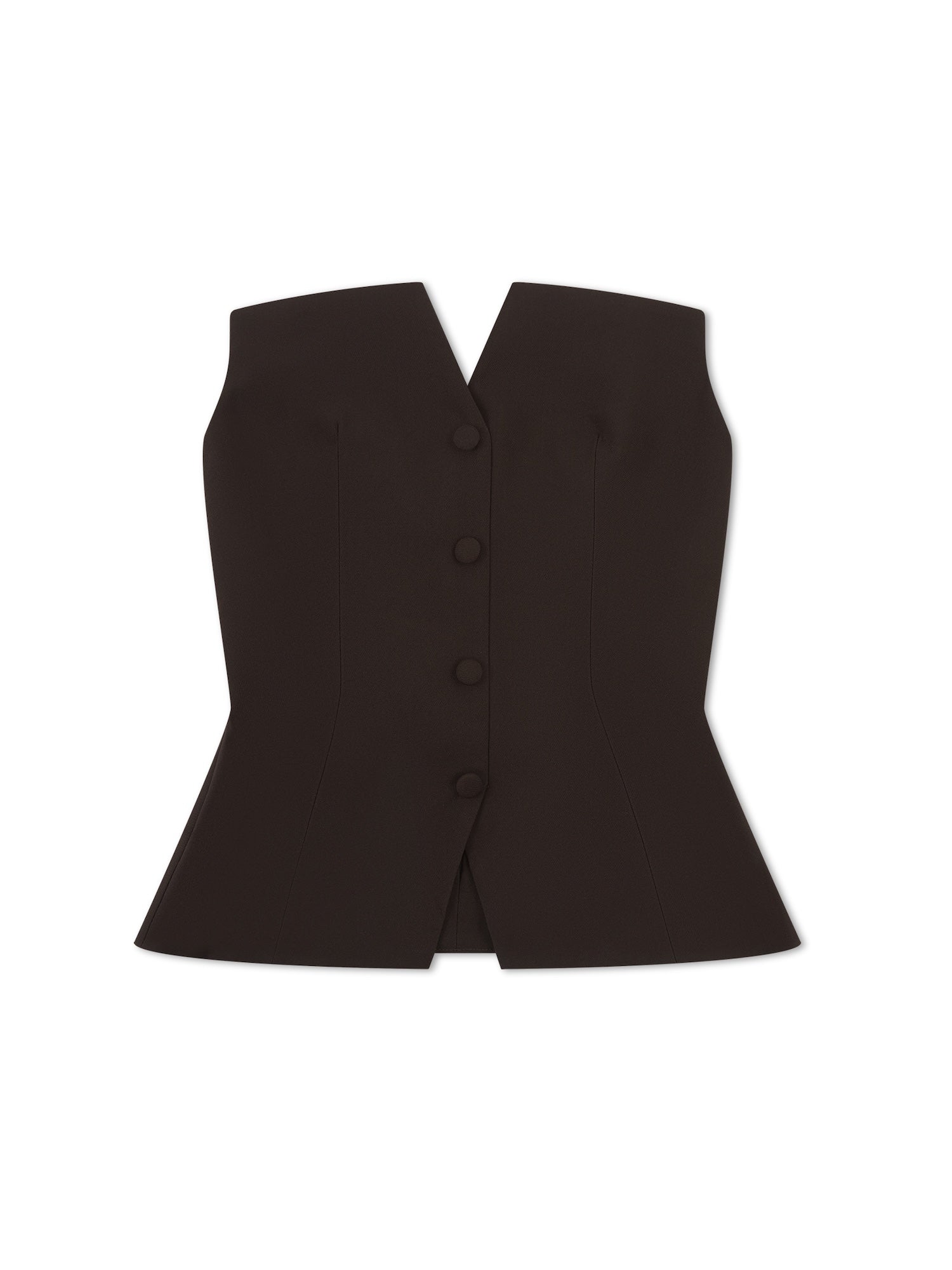 A structured bandeau top defined by an exaggerated square neckline. Features mock button-down detailing through the front, with a shirred back and centre back zip for ease of wear.