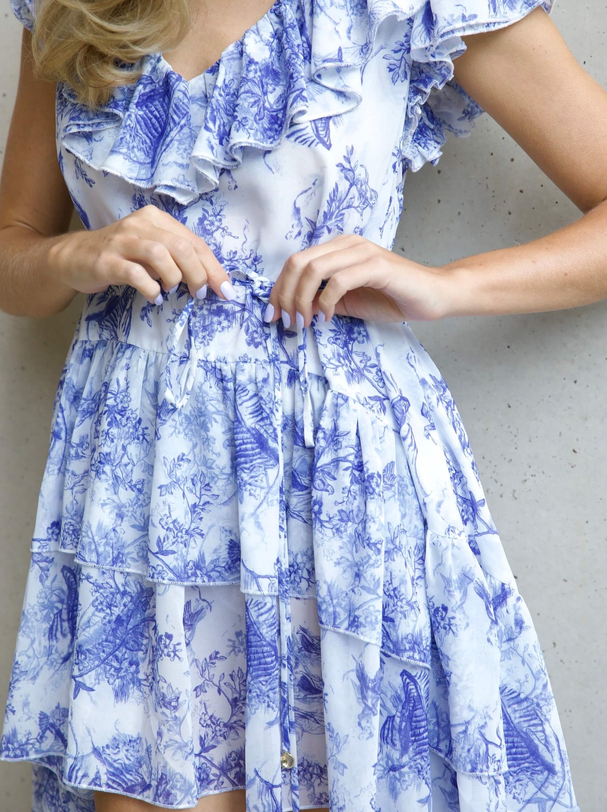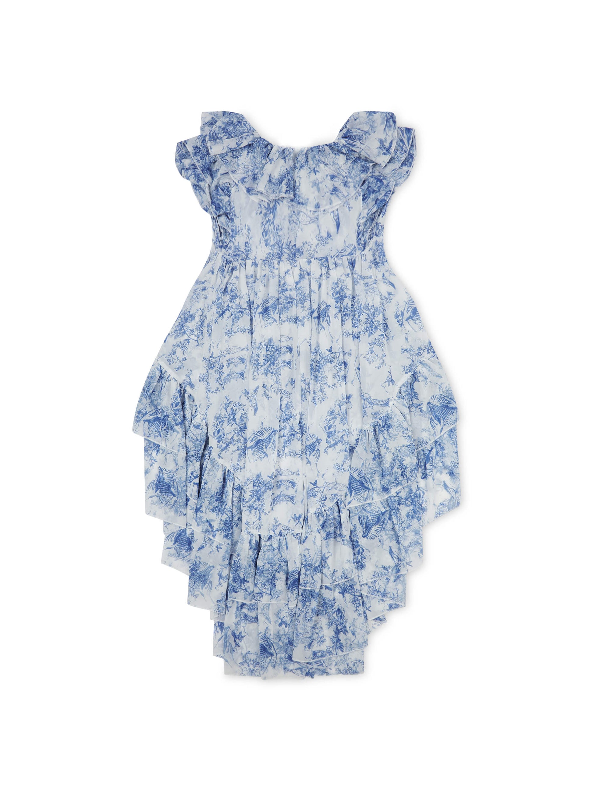 Adorned with our all over signature toile print, this sleeveless dress has been beautifully designed with a high-low shaped skirt with exaggerated volume for a flattering yet playful silhouette. The ruffle detail V-neckline contributes a touch of femininity, and the detachable belt offers an option to accentuate the waist. This statement piece is perfect for your next special occasion.