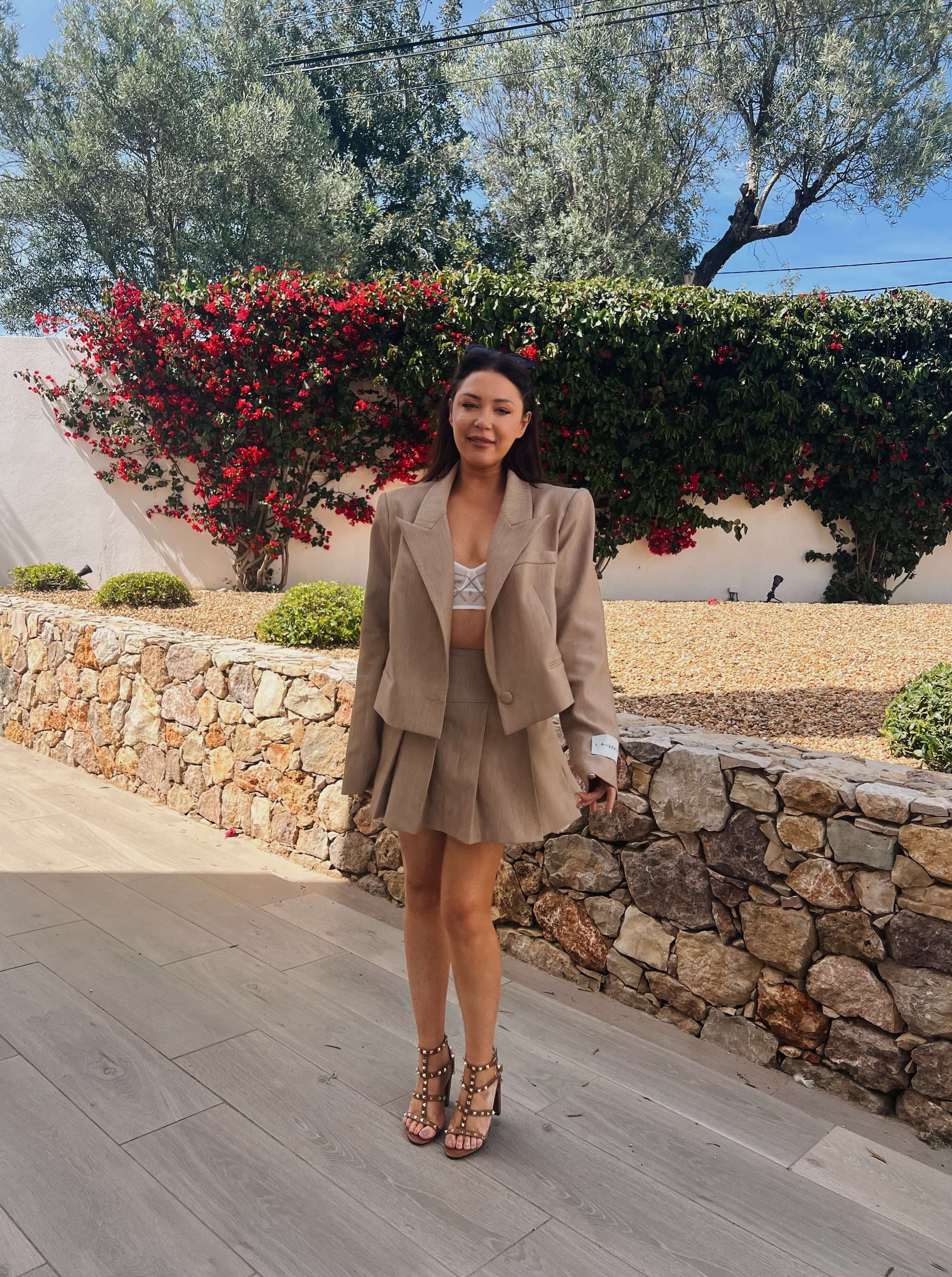 Offering a clean, tailored aesthetic and cut in a classic A-line silhouette - our pleated skort is a high-waist fit with hidden shorts, and a concealed side zip, combining style and practicality. Ideal for any event - a timeless fashion piece that never fades. Part of a two-piece set, shop our ‘'HARLOW' CROPPED TUXEDO BLAZER CAMEL’ here.