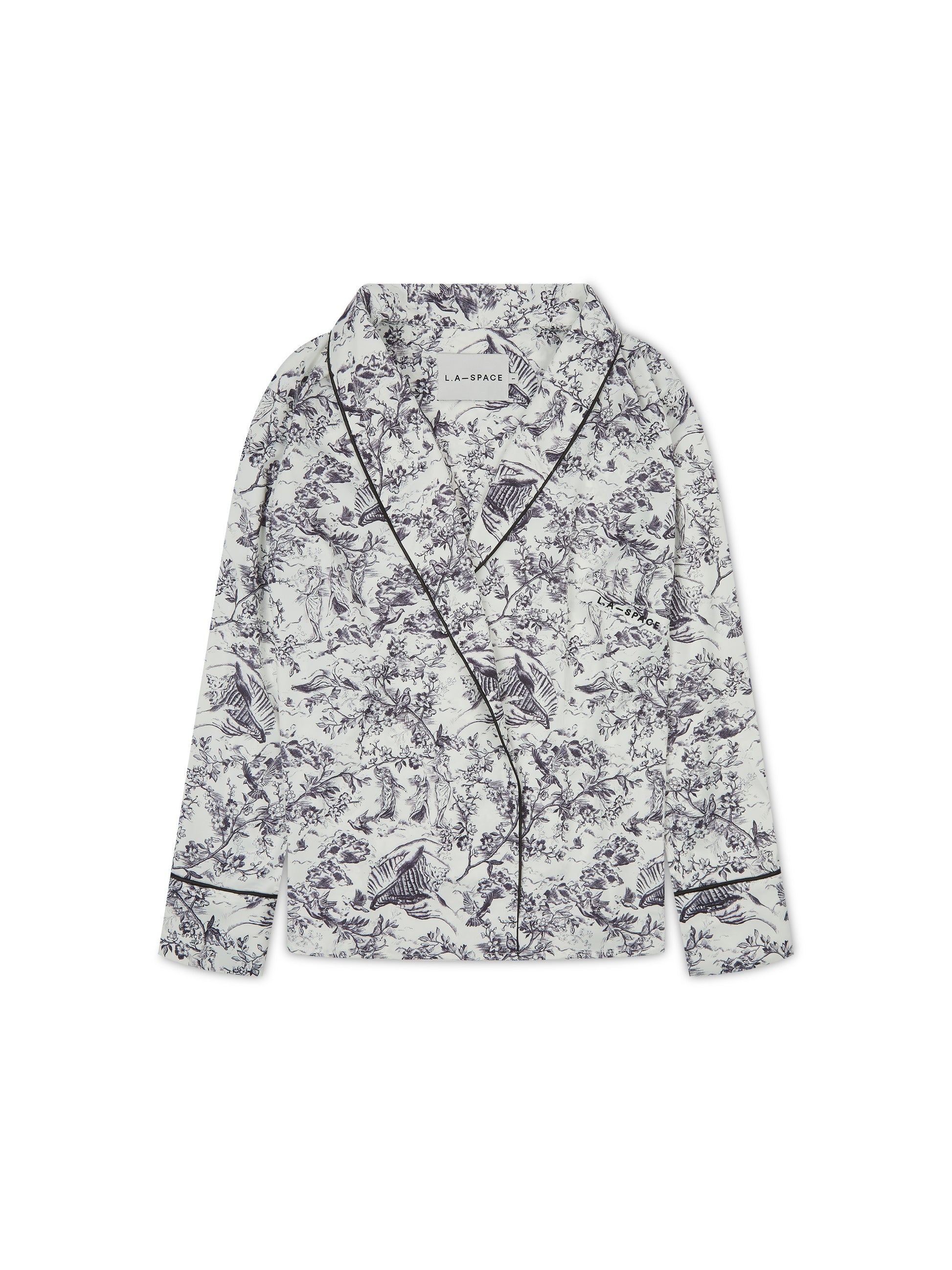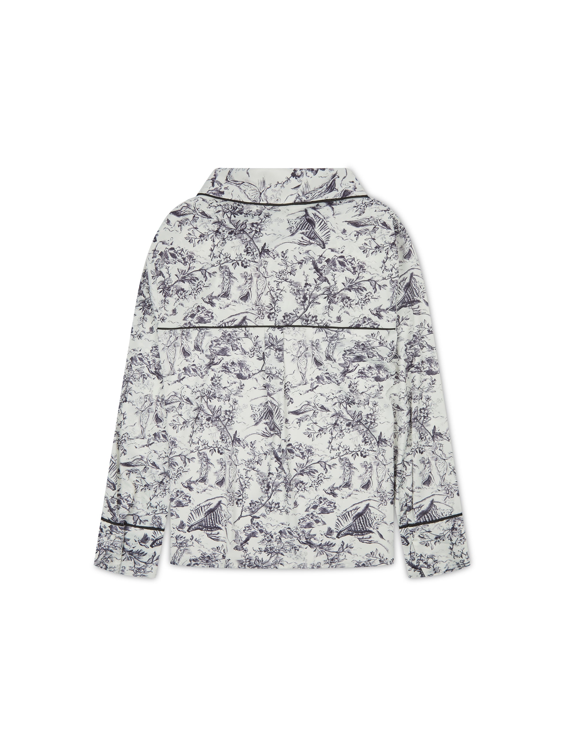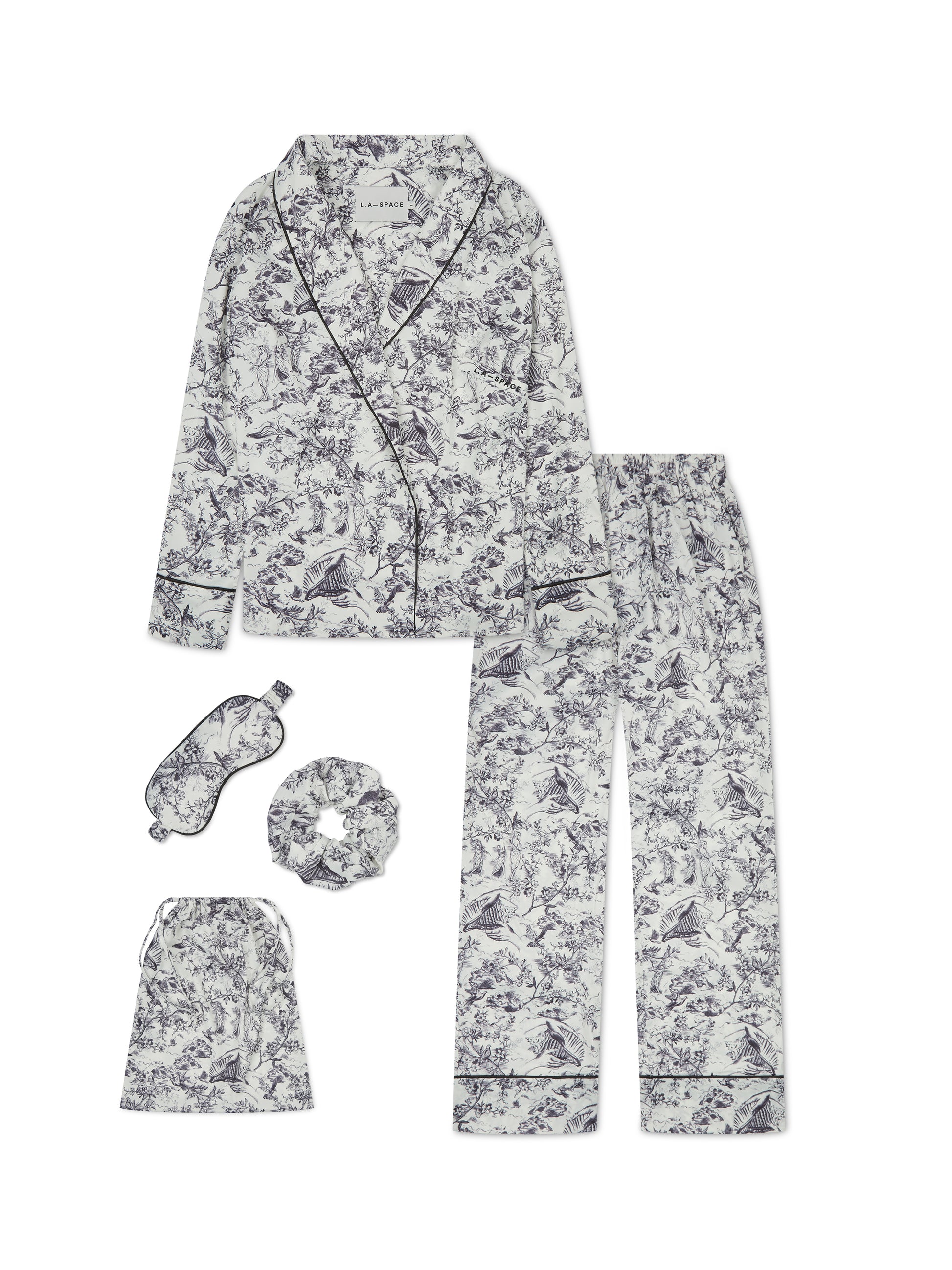 Our classic signature toile print pyjama set redefines bedtime luxury. This 5-piece set includes a stylish double-breasted sleep shirt, wide-leg trousers, a soft eye mask, a matching scrunchie, and a dust bag. Perfect for gifting or personal pampering.