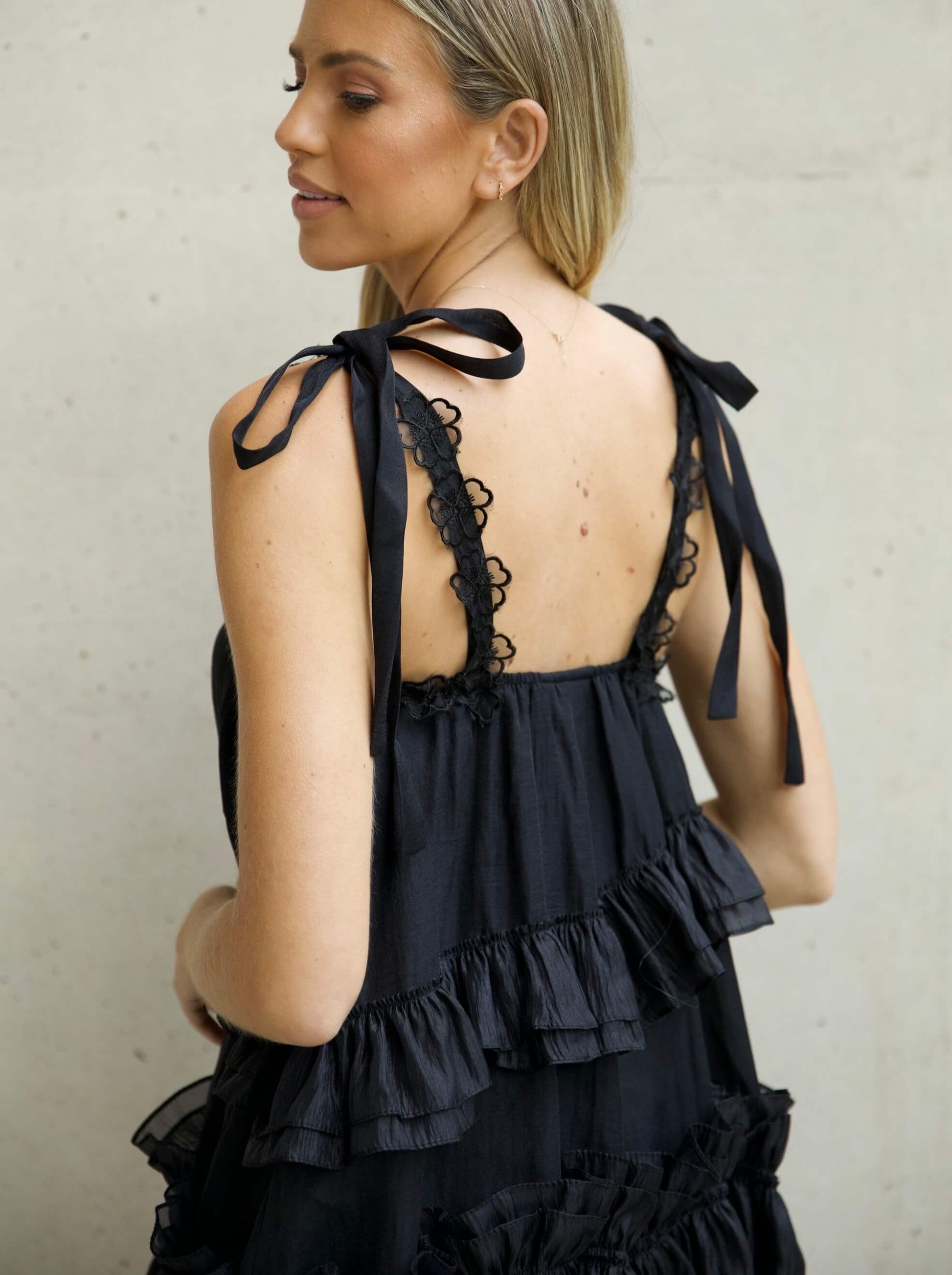 LBD, but make it a playsuit! Giving the illusion of a dress, but the modesty of a playsuit. This bubble hem pull-on style features adjustable tie shoulder straps, and a square neckline adorned with delicate floral appliques, ruffle detailing on the body for extra drama, and elasticated leg openings on the shorts for extra comfort. This style can be dressed up or dressed down, making it perfect for any occasion.
