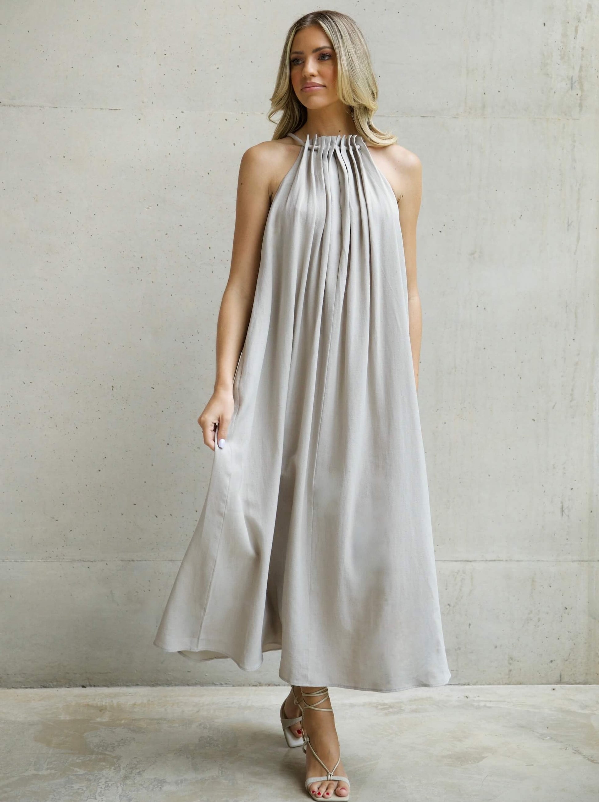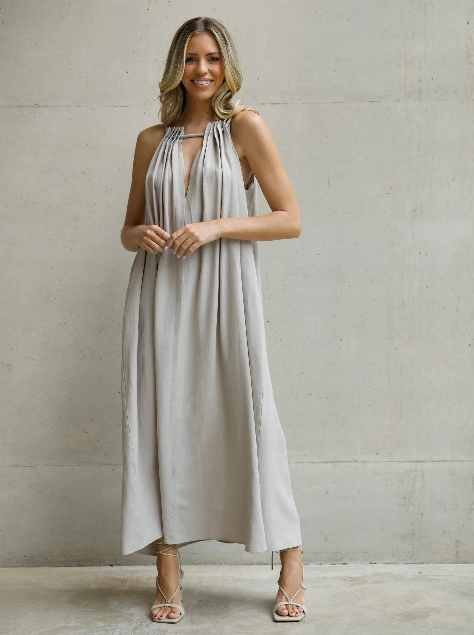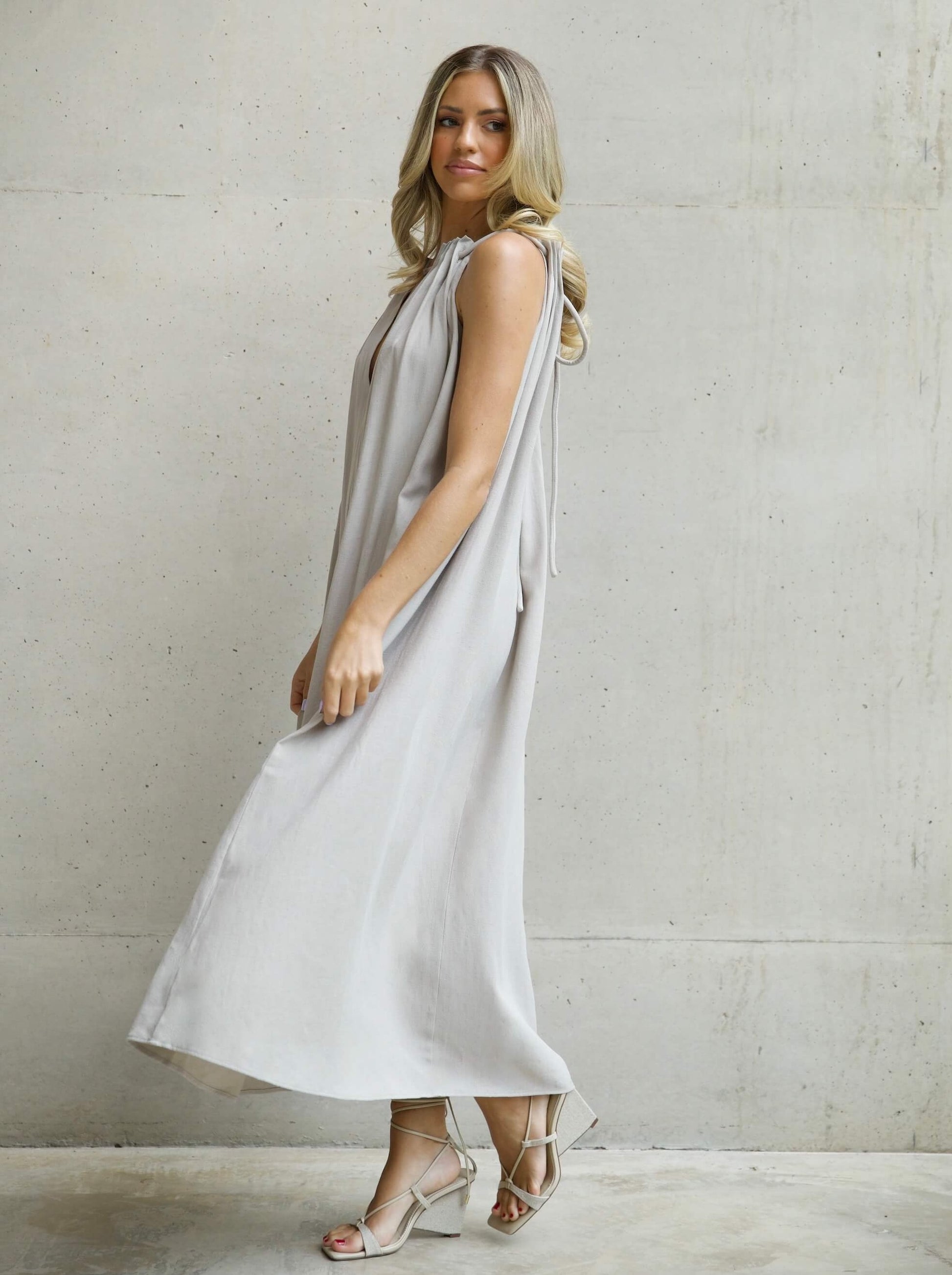 Crafted from a cool linen blend, our trapeze silhouette in maxi length features an adjustable V-neckline with rope detailing and flattering pleats. This piece provides a great base for standout accessories or dressing down. Pair with your favourite sandals for a chic summer look.