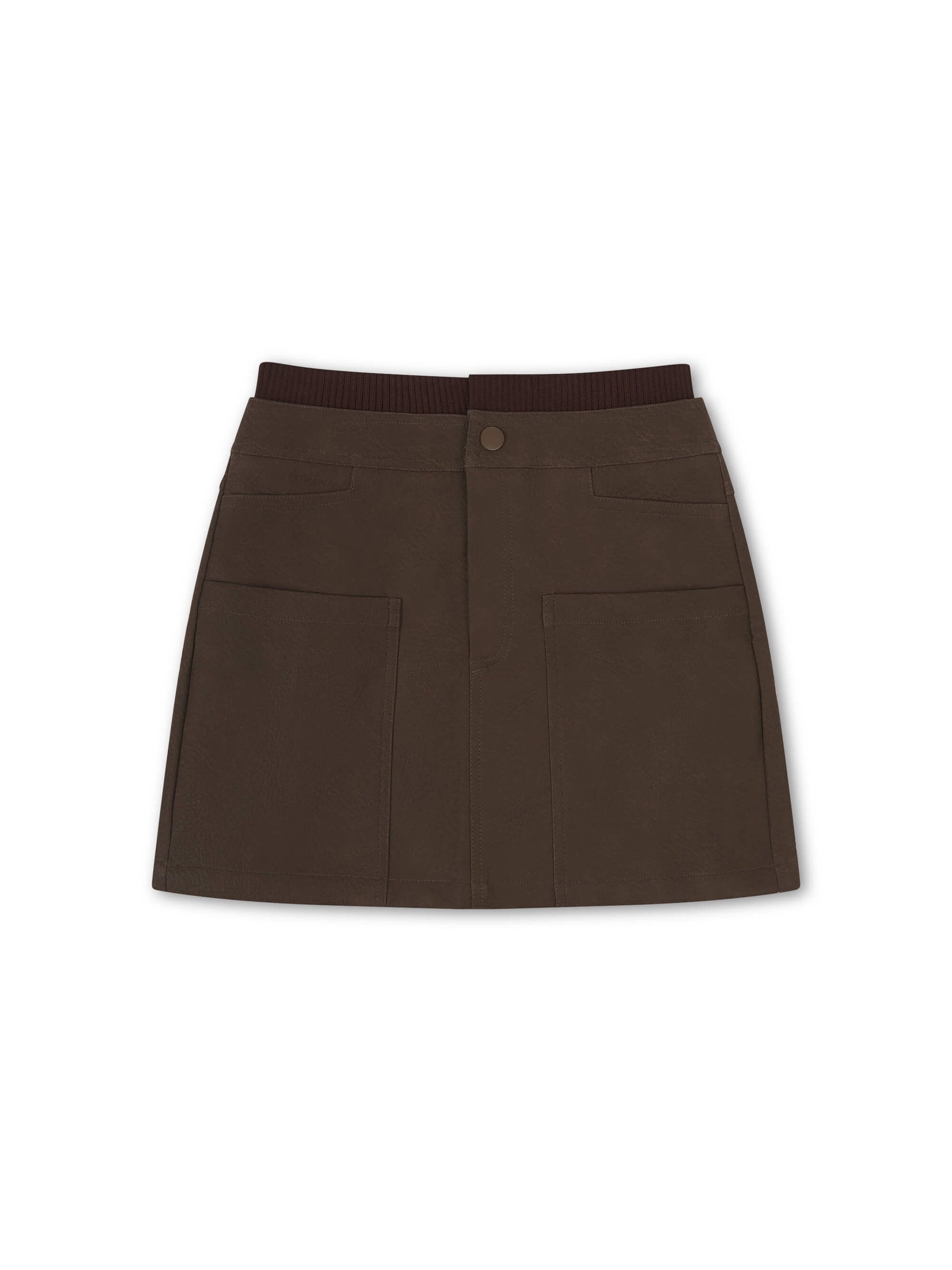 Elevate your look with our Cargo Mini Skirt. Designed in a faux leather with utilitarian front pockets and a clean front fly fastening, it’s finished with a contrast knitted waistband for a refined touch. Perfectly paired with our best-selling 'Sienna Jacket in Chocolate' for an effortless, coordinated set.