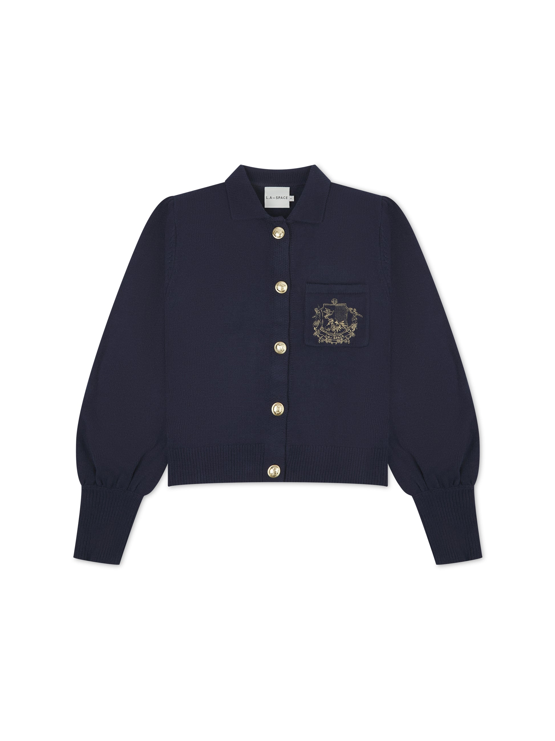 This stylish piece is adorned with a crest detail on the front chest pocket and front buttons, finished with deep cuffs and a ribbed hem for an extra touch of elegance.